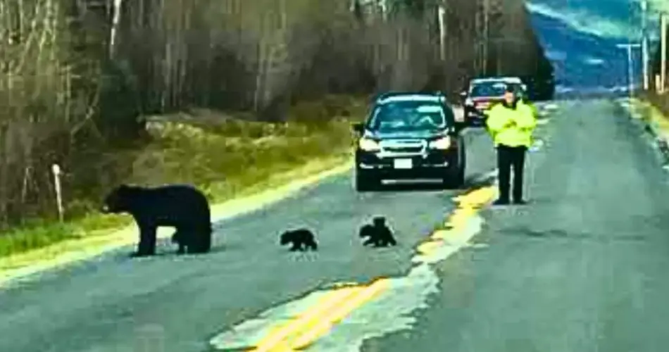 Owens was sitting in his patrol car when he noticed a mama black bear and her four cubs crossing the road back and forth over and over again. After watching for a while, Owens realized why the family kept crossing the road: one of the cubs kept falling behind, and his loving mom was trying to encourage him to keep up.